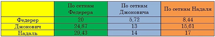 Теперь легко определить ожидаемое количество титулов Джоковича, Надаля, Федерера по сеткам друг друга. Результаты приведены в таблице 10.