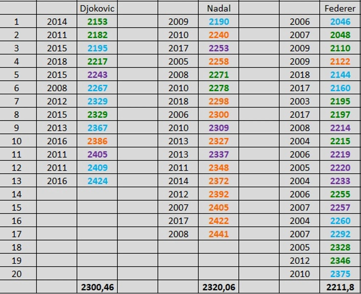 В расчётах, применяемых в этой статье, используется рейтинг Эло с этого сайта. Следует отметить некоторые его особенности. Так, если в классическом рейтинге Эло изменение количества очков зависит только от результата и разницы в рейтинге между игроком и его оппонентом, то здесь также учитываются уровень и стадия соревнования. Действительно, чем крупнее турнир и позднее стадия, тем ответственнее теннисисты подходят к игре и сильнее выкладываются; стало быть, за победу в финале ТБШ при прочих равных условиях будет получено больше очков, чем за выигрыш в четвертьфинале турнира серии «500». Ещё одна особенность – это постепенное уменьшение рейтинга в случае долгого отсутствия. Если в классическом варианте рейтинг сохраняется независимо от периода, в течение которого спортсмен не играл, то здесь каждый год происходит уменьшение на 100 пунктов. Это изменение выглядит логичным, ведь, хотя класс игры теннисиста никуда не девается, уровень явно снижается при долгом отсутствии практики.