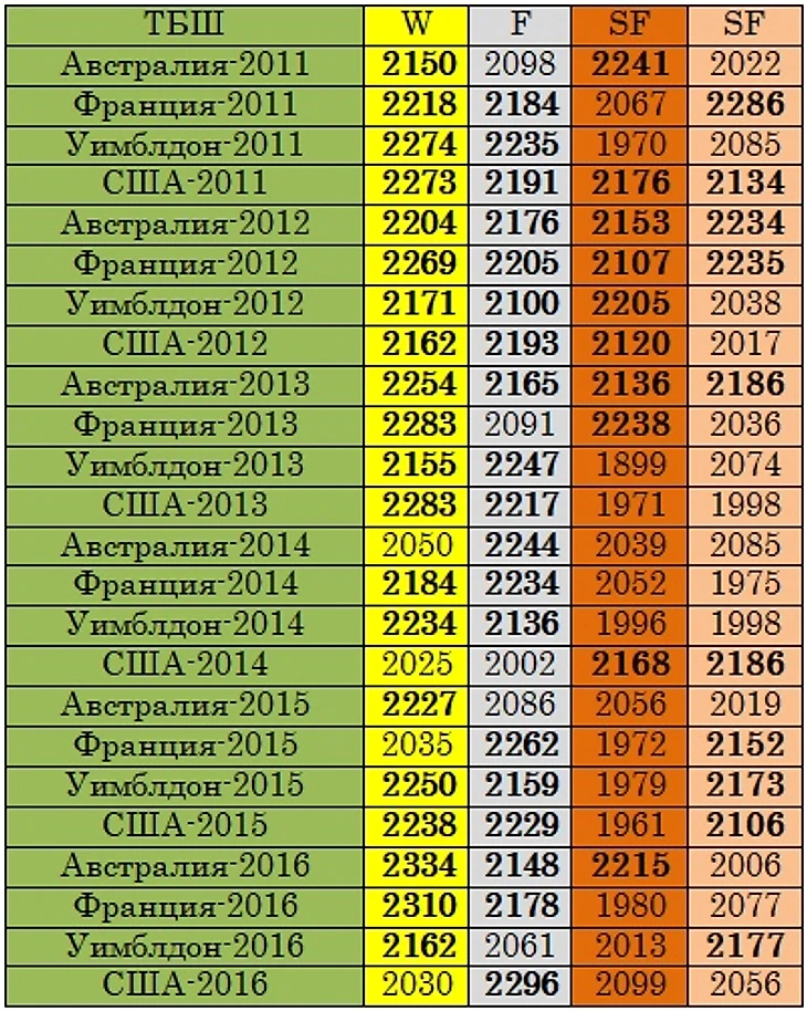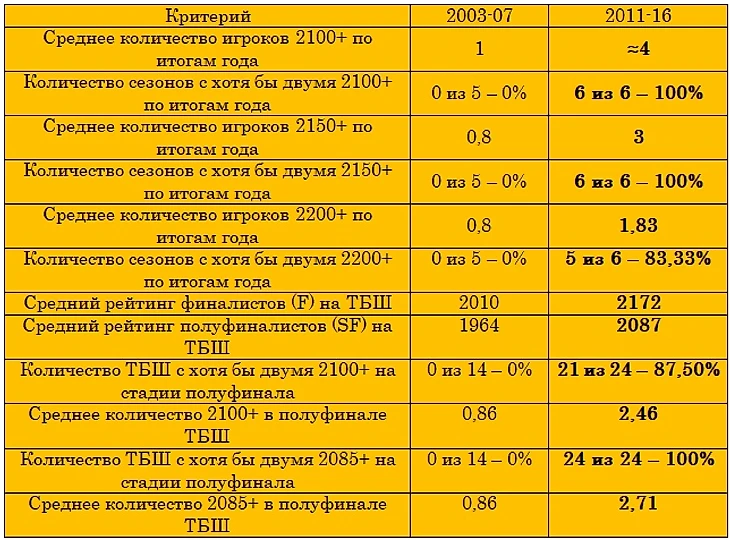 В то же время период 2011-16 годов обладает невероятными показателями: в среднем 4 теннисиста уровня 2100+; 2172 как средний рейтинг проигравших в финалистов ТБШ и 2087 – полуфиналистов; в среднем 2,46 теннисиста уровня 2100 и выше в полуфиналах ТБШ (только восьмая часть ТБШ обошлись без двух таких игроков на стадии полуфинала). Стало быть, ввиду очень сильного тура эпоху 2011-16 годов можно назвать Золотой Эрой тенниса.