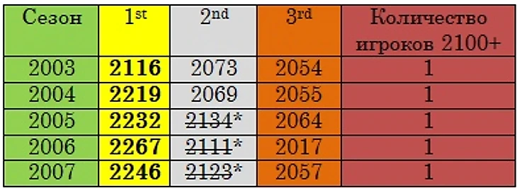 Все результаты в таблице получены с использованием рейтинга Эло на достаточно большой дистанции, то есть являются очень точными. Сравнение двух эпох наглядно показывает, что эра 2003-07 годов проигрывает по абсолютно всем параметрам, то есть является довольно слабой. Более того, вне грунта в период с июля-2003 до декабря-2007 был максимум 1 сильный в историческом масштабе игрок (т. е. с реальным рейтингом 2100+), то есть по определению коллапса мы получаем, что он имел место быть.