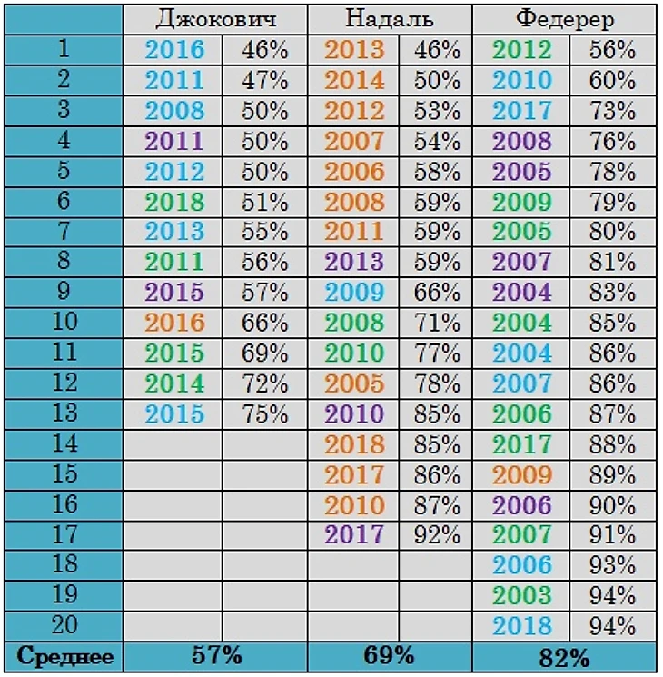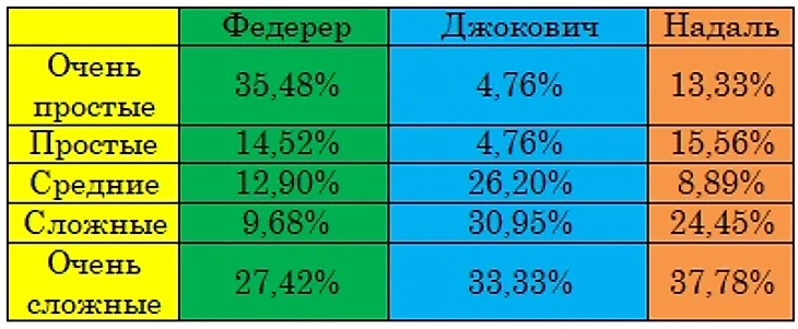 Из этой таблицы видно, что Федерер только два раза выигрывал ТБШ по сложной сетке: 56% на Уимблдоне-2012 и 60% в Австралии-2010. Аналогичные показатели Джодаля составляют 9 и 8 титулов соответственно. Зато по лёгким сеткам швейцарец взял целых 14 титулов, в то время как серб с испанцем только 5 (0 + 5). Самые сложные титулы ТБШ у Джоковича (Австралия-2016) и Надаля (Франция-2013) – 46%, самые простые – у Роджера (Уимблдон-2003 и AO-2018) – 94%. В среднем сложность сетки Новака на выигранных ТБШ составляет 57%, Рафаэля – 69%, швейцарца – 82%. Таким образом, в карьере Федерера действительно самые лёгкие сетки на победных ТБШ, что и требовалось доказать.