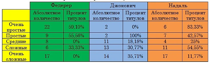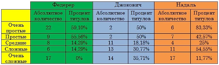 Заметим, что 0% титулов Джоковича по очень лёгким сеткам, очевидно, заниженный показатель, а 100% по лёгким – завышенный: в самом деле, на достаточно большой дистанции серб выиграет хотя бы один очень лёгкий титул и не выиграет хотя бы один лёгкий. Для получения более объективной картины заметим, что по лёгким и очень лёгким сеткам Ноле выиграл 2 из 4 ТБШ (50%), то есть можно считать, что его реальный процент в обоих случаях примерно равен 50%.