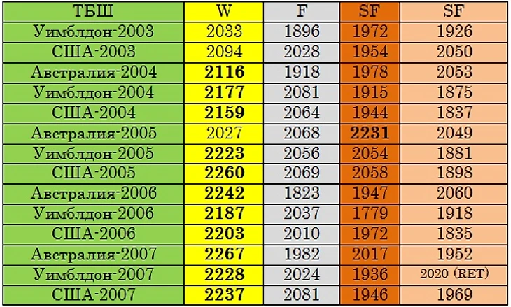 Согласно убеждениям сторонников «теории коллапса», единственным таким игроком во время 2003-07 годов был Надаль на грунте (2005-07). Для того, чтобы проверить данную гипотезу, рассмотрим количество теннисистов с реальным хардово-травяным рейтингом, большим или равным 2100, на полуфинальных и финальных стадиях негрунтовых ТБШ, а также по итогам сезонов, в промежуток времени с июля-2003 по декабрь-2007. Результаты приведены в таблицах 1 и 2 (жирным выделены игроки с рейтингом 2100+).