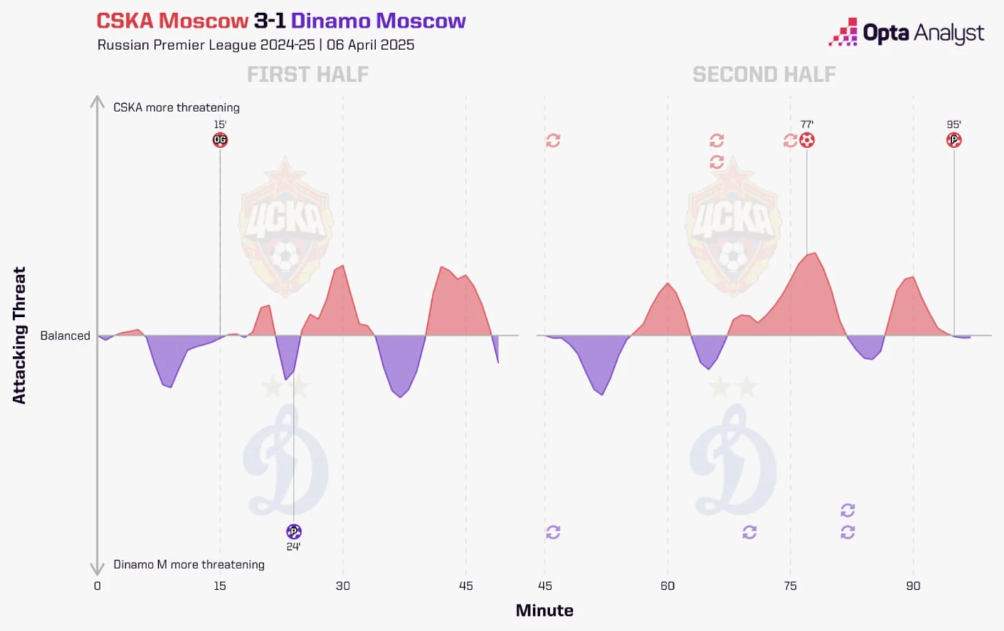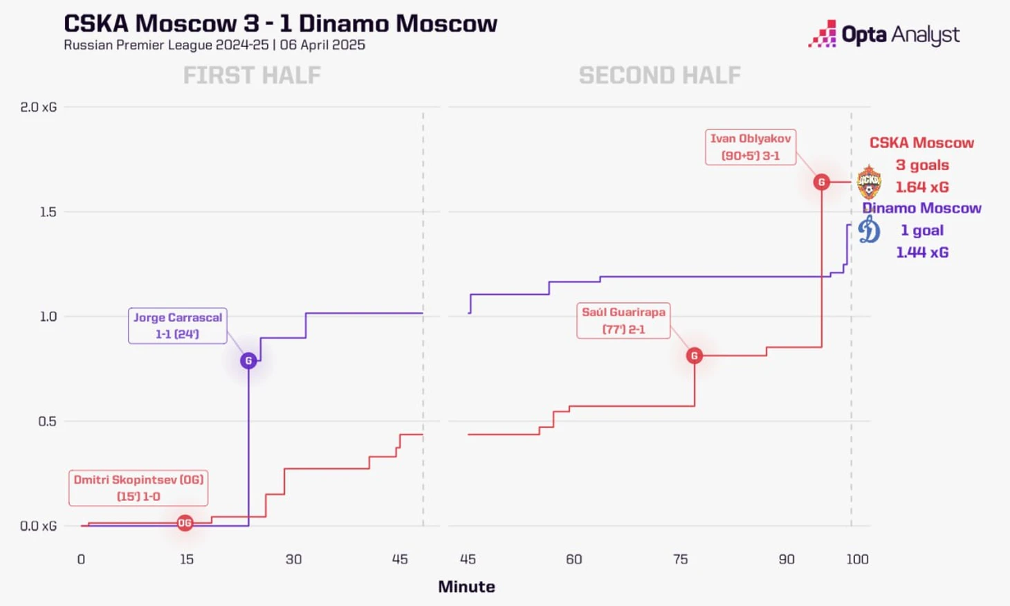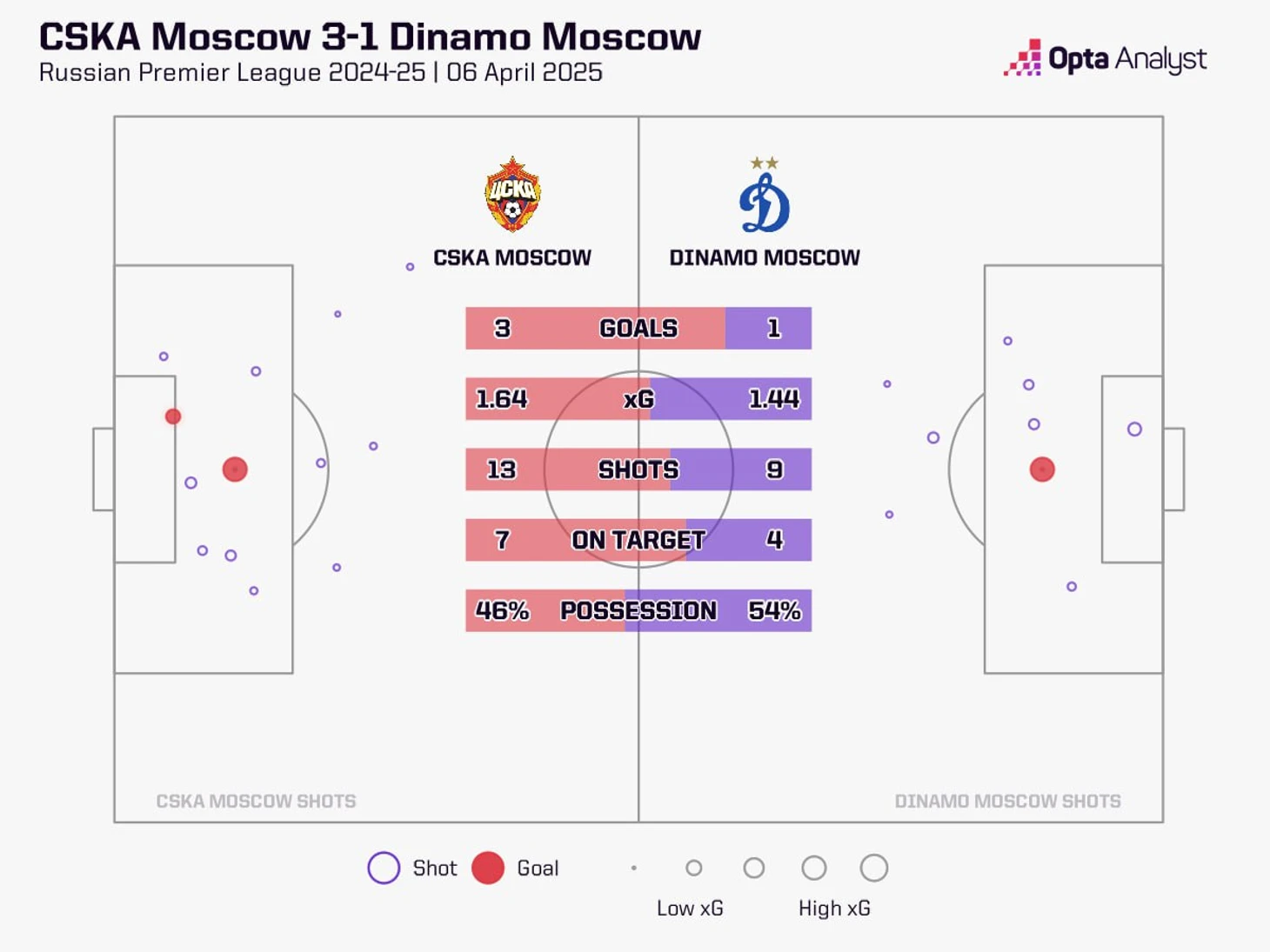 Глядя на статистику от Opta, сразу и не скажешь, что преимущество в первой половине было на стороне хозяев. Но это только на первый взгляд. До и после забитого мяча «армейцы» смотрелись лучше, хоть и далеко не идеально действовали в финальной трети поля.