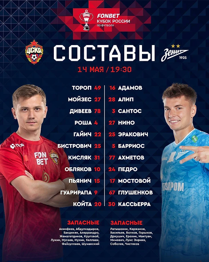 Состав был максимально предсказуем: «армейцы» уже практически решили свои задачи в чемпионате, поэтому побороться за Кубок было не то что можно, а просто необходимо. Вопросы были исключительно по вратарской позиции (висел в воздухе вариант с Акинфеевым в воротах), но после самого матча они полностью отпали: Тороп провёл пока что лучший матч в своей карьере.