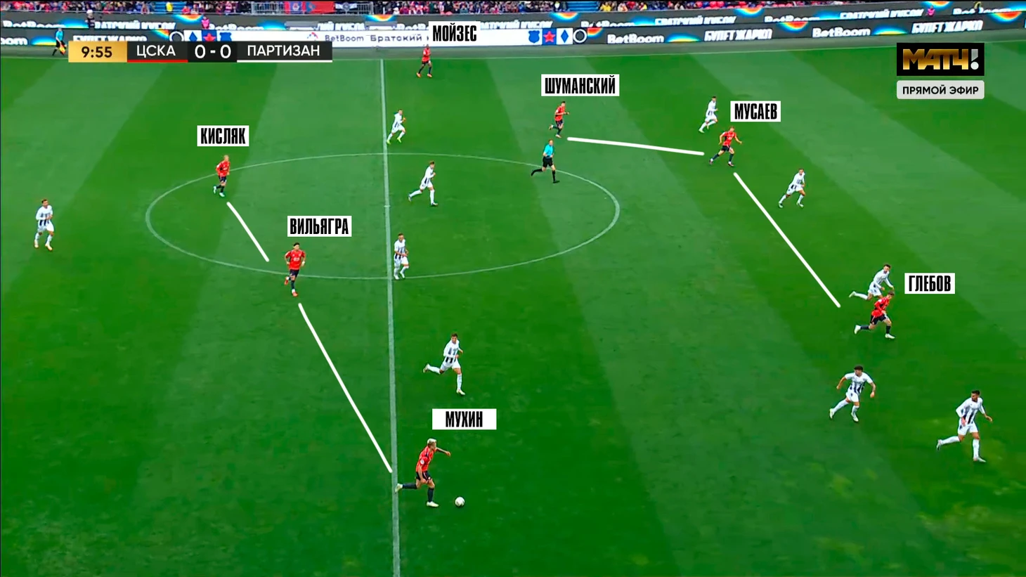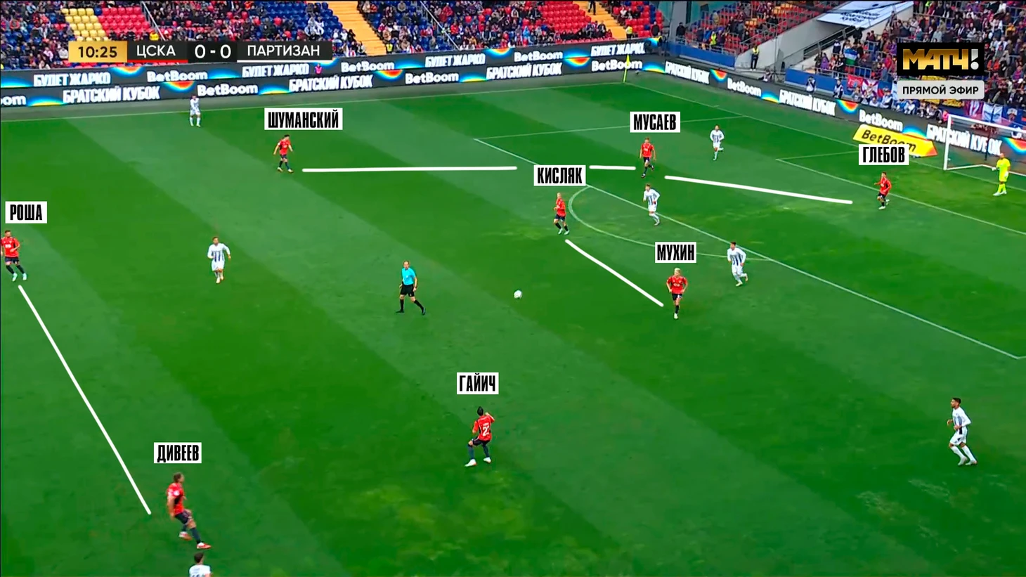 Так, например, был забит первый мяч в игре: Глебов (ПВ) сместился в центр, сделал передачу Кисляку (АПЗ), тот отдал на фланг на Мусаева (ФРВ), и после серии рикошетов сам же Глебов открыл счёт, находясь на позиции предпоследнего.