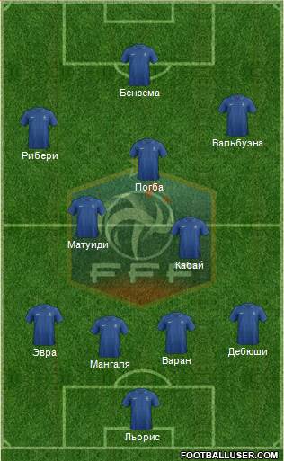 Уго Льорис, Стив Манданда, Матьё Дебюши, Бакари Санья, Патрис Эвра, Лоран Косиелни, Рафаэль Варан, Йоан Кабай, Блез Матуиди, Поль Погба, Мусса Сиссоко, Матьё Вальбуэна, Франк Рибери, Лоик Реми, Карим Бензема, Оливье Жиру.