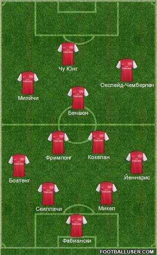 "Арсенал" (4-2-3-1): Фабиански - Йеннарис, Скиллачи, Микел, Боатенг - Фримпонг, Кокелан, Бенаюн - Мияйчи, Окслейд-Чемберлен, Чу Юнг.