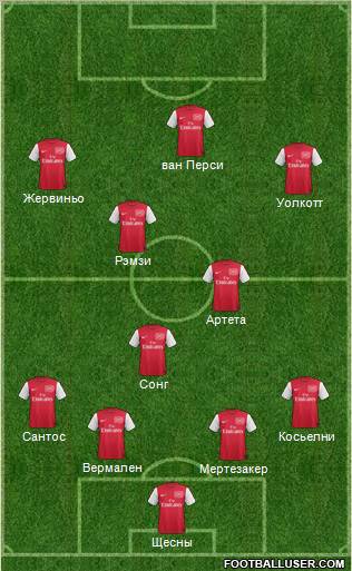 "Арсенал" (4-1-2-3): Щесны, Косьелни, Мертезакер, Вермален, Сантос, Сонг, Рэмзи, Артета, Жервиньо, Уолкотт, ван Перси.