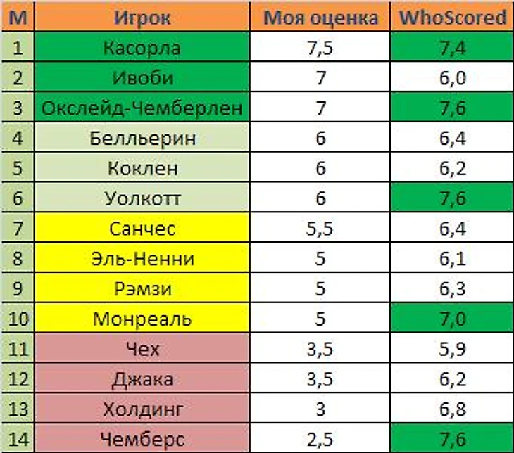 Вспоминая матч с Ливерпулем, я решил сделать табличку, сопоставив собственное мнение о выступлении игроков Арсенала с оценками от WhoScored: