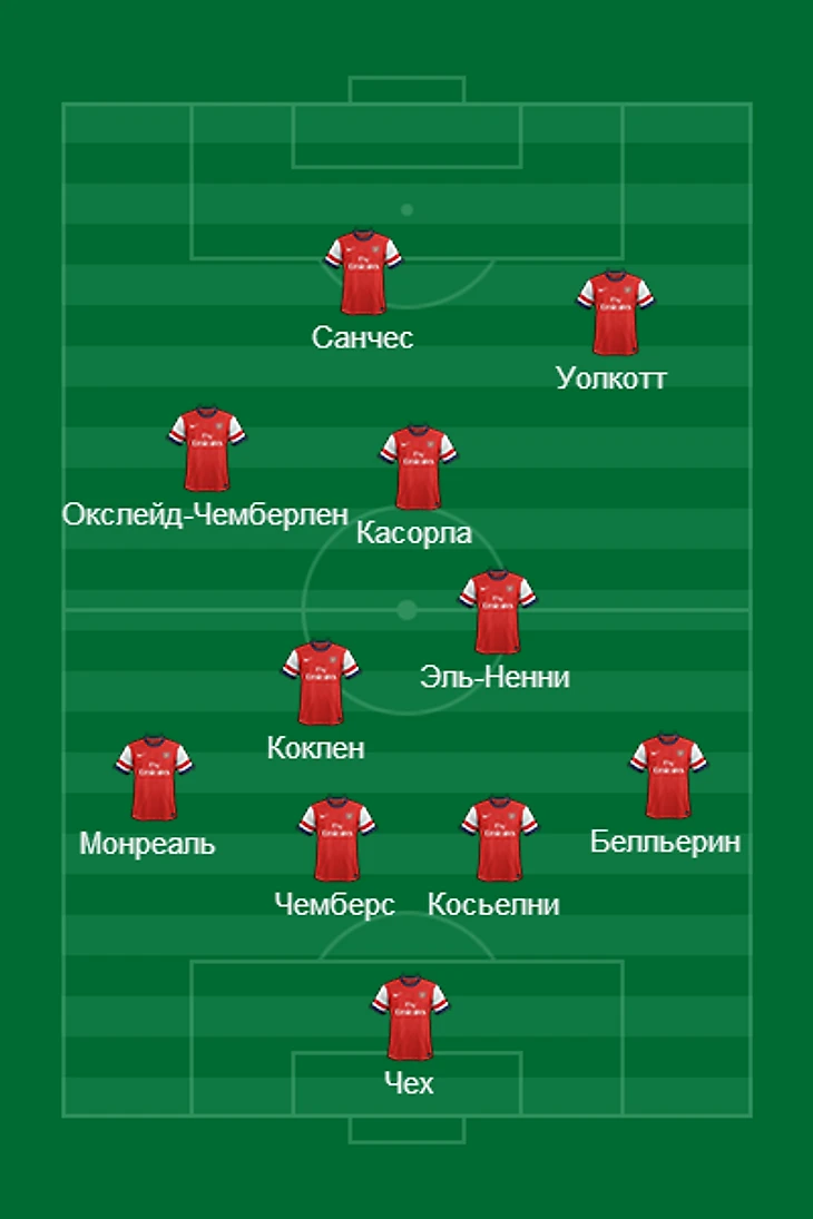 Как видите, здесь существует 3 изменения по сравнению с предыдущей встречей: Касорла вместо Рэмзи, Окслейд-Чемберлен вместо Ивоби и Косьелни вместо Холдинга. Если по первым двум изменениям всё ясно (наилучшие кандидаты вместо травмированных игроков), то выход Косьелни вместо Холдинга, а не Чемберса может быть оправдан тем, что новенький англичанин проявил себя не лучшим образом в матче с Ливерпулем и привёз несколько голов в свои ворота.