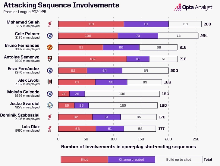 У «Челси» в прошлом сезоне были проблемы в матчах с топовыми клубами АПЛ, где набрали всего 10 очков наравне с «Астон Виллой». Но при выдающемся объему работ по всему полю центральных полузащитников, креативности вингеров и замерзешего Кола Палмера + уверенность после побед на турнирах - «Челси» имеет все шансы попасть в тройку и пошуметь в ЛЧ ввиду своего класса и запаса. Также, от Палмера жду серьезной заявки на золотой мяч в этом сезоне. В прошлом сезоне креативщик «Челси» был вторым по созданию моментов с завершением ударов, после Мо Салаха. Мы можем убедиться в этой таблице в важности центральных полузащитников в футболе Марески - где Касейдо больше всех в этой подборке игроков начинает атаки с завершением ударом по воротам и Энцо Фернандес, который сам и созидает атаки, и бьет по воротам.