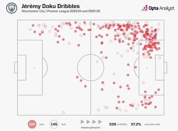 Такая статистика дает надежду на соответствующее снабжение на остре атаки, хоть и без креатива ушедшего бельгийца, но свои моменты «Сити» с помощью Рейндерса иметь будет. Также, был приобретен вечно молодой и перспективный Шерки из «Лиона», яркий и техничный атакующий полузащитник напоминающий своей игрой Грилиша. Последний тоже является одной из причин «провалов» сезона, так как Гвардиола контролирует и планирует все, кроме входа в штрафную вингеров «Сити», у них огромное количество попыток дриблинга в последней трети и не удивительно, что Грилиш, Доку и Савиньо (который может уйти этим летом) имели достаточно брака, но Савиньо и Доку обладает хорошей скоростью, что увеличивает разносторонность тактики для атаки и играли игроки на более удачном уровне, нежели англичанин.