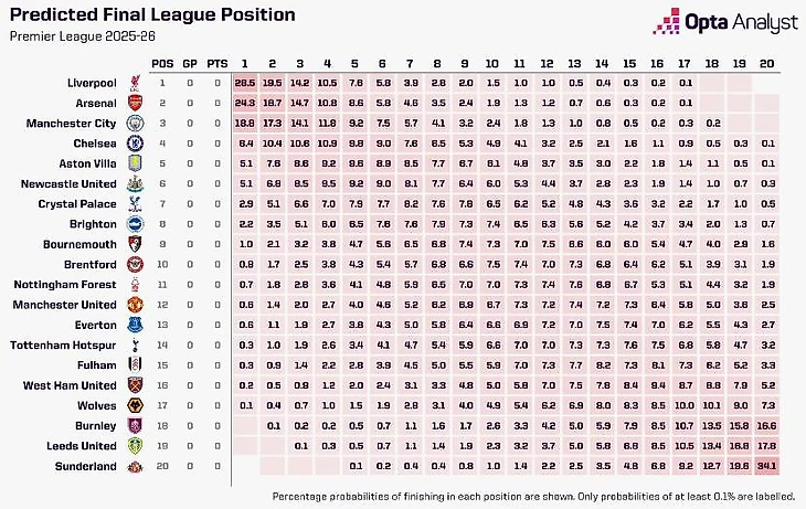 Начнем c того, что аналитический портал Opta выкатил прогноз на распределние мест в предстоящем чемпионате
