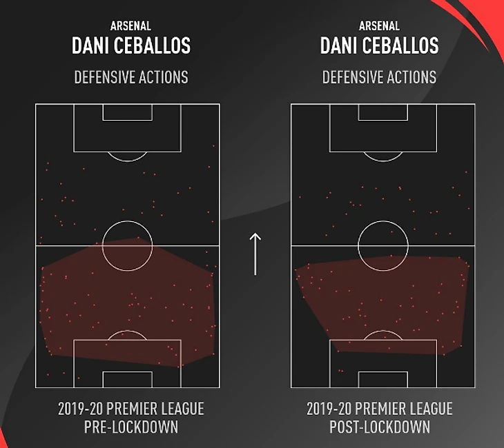 Впечатляюще для игрока, которого ни во что не ставили перед рестартом сезона. Теперь он не только не проваливал опорную зону, а наоборот улучшал её. Нельзя не отметить его подключение вторым ходом и очень нужный гол в матче с "Шеффилдом".В паре с Джакой они стали отлично друг друга дополнять, и низкая креативность Гранита стала незаметна на поле, а позиция Себальоса перестала проваливаться после потерь при продвижении мяча вперёд.Для наглядности карта оборонительных действий Дани.Вместо того ,чтобы совершать защитные действия по всему полю он сосредоточился на меньшей зоне и это принесло результат.
