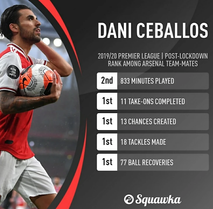 Нельзя назвать этот год Себальоса действительно успешным, так как до приостановки сезона Дани так и не нашел свою игру. Конечно же сказалось и то , что он за шесть месяцев поиграл у трёх разных тренеров. Также разрыв коленного сухожилия и вылет на два месяца ещё больше усугубил ситуацию.Весь сезон для испанца выглядел ужасающие, но пауза пошла ему на пользу.С 17 июня он стал важнейшим игроком команды.Он стал незаменимым,ведь именно он разгонял атаки и при всём притом оказывал огромную поддержку,когда команда садилась в оборону. Вот его статистика за этот период.