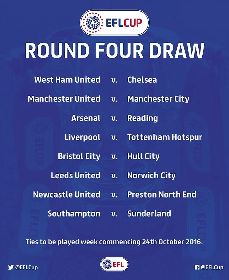 Жеребьевка феерическая. "Арсенал" - "Рединг". "Вест Хэм" - "Челси". "Манчестер Юнайтед" - "Манчестер Сити". "Ливерпуль" - "Тоттенхэм". "Саутгемптон" - "Сандерленд".