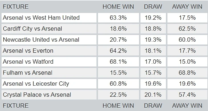 Это вероятность того, что Арсенал получит следующие очки, учитывая приведенные выше коэффициенты в каждом матче:
