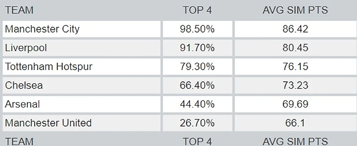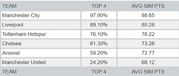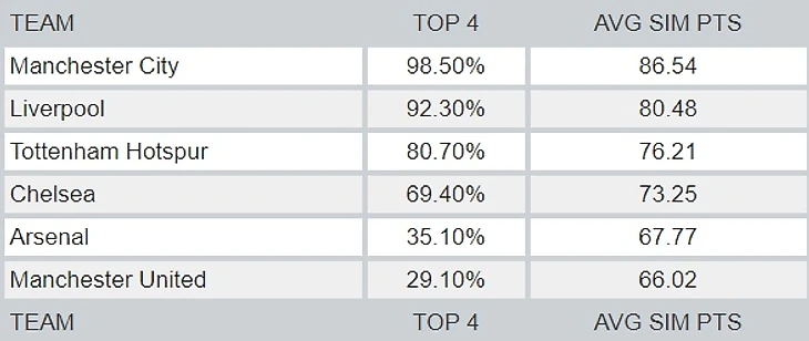 Потеря очков с Челси нанес сильный удар, но по-прежнему шансы на попадание в топ-4 составляет около 50%.