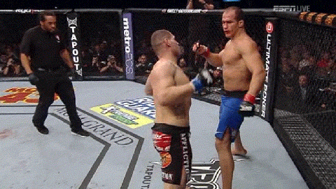 Первый бой двух лучших тяжеловесов UFC. Перед этим поединком ходил слух, что у Дос Сантоса была травма ноги и об этом знал Веласкез, т.к. в тренировочном лагере Дос Сантоса был шпион, «сливший» информацию в АКА. Но перед боем было еще и предупреждение – «не моргайте»! Так как можно пропустить, как кто-то кого-то нокаутирует.