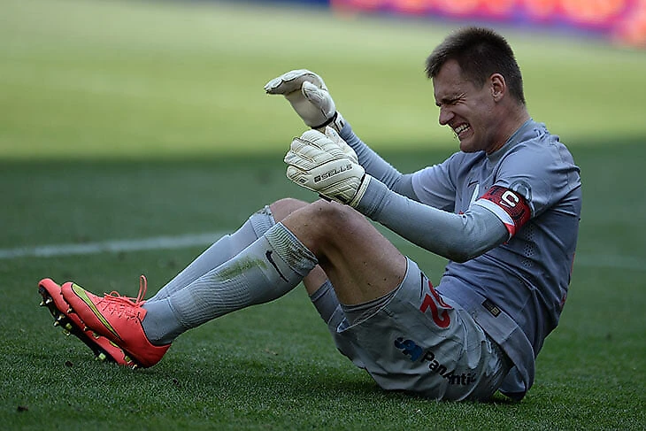 Я все детство играл на резинке на Пролетарке – из больших пластов поперек поля. В 17 лет тренер предложил в поле побегать. И случился такой момент: мяч уходит за лицевую, а я его догоняю и простреливаю в штрафную. Движение для вратаря непривычное, опорную ногу не так поставил, слышу – хрум, что-то щелкнуло. Домой прихожу – колено размером с голову, никто не понимает, как быть. Сделали МРТ – кресты.