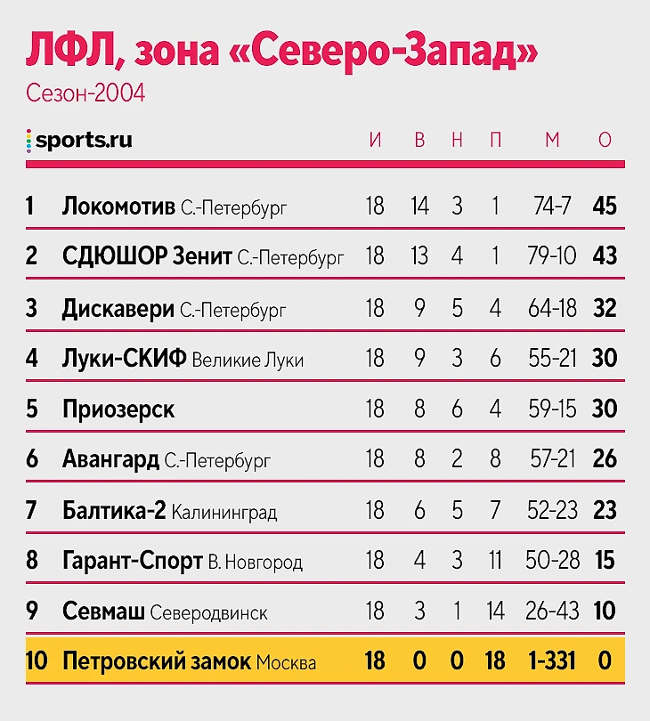 От редакции. Пару недель назад телеграм-канал «Финт в очко» напомнил о «Петровском замке». Этот клуб на стыке 90-х и 2000-х играл в КФК и устанавливал недостижимые рекорды по поражениям и пропущенным голам. Например, сезон-2004 закончился так.