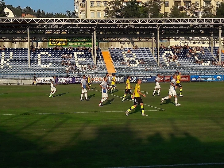 На хозяевах поля хотелось бы остановиться поподробнее. Чисто формально, нынешний ФК «Севастополь» никакого отношения к «Севастополю», выступавшему в чемпионате Украины, не имеет. Тот клуб был ликвидирован сразу после присоединения/аннексии (кому как больше нравится) полуострова к России. Являвшийся владельцем клуба украинский предприниматель Вадим Новинский прекратил его финансирование и покинул Крым. Поэтому официальным годом основания нынешнего «Севастополя» считается 2014-ый. От украинского предшественника новый клуб перенял цвета и немного измененную эмблему. Теперь вместо херсонесского колокола на логотипе изображен герб города, а к белой и голубой лентам в правой части эмблемы добавлена красная.