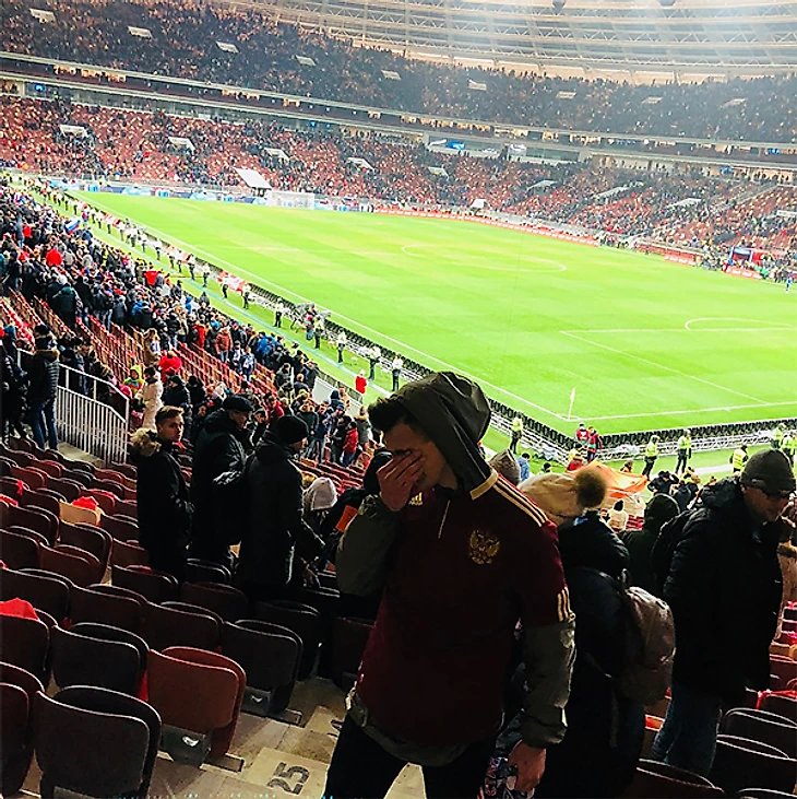 Идиотские узкие потоки до метро, вход в которое сильно ограничен, живые ограждения из ментов и ввшников. В итоге за кордоны вышли только через 40 минут, а на матче было чуть больше 30 тысяч.