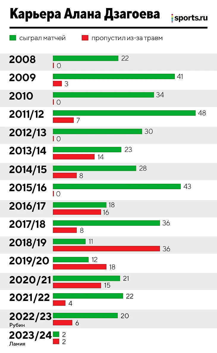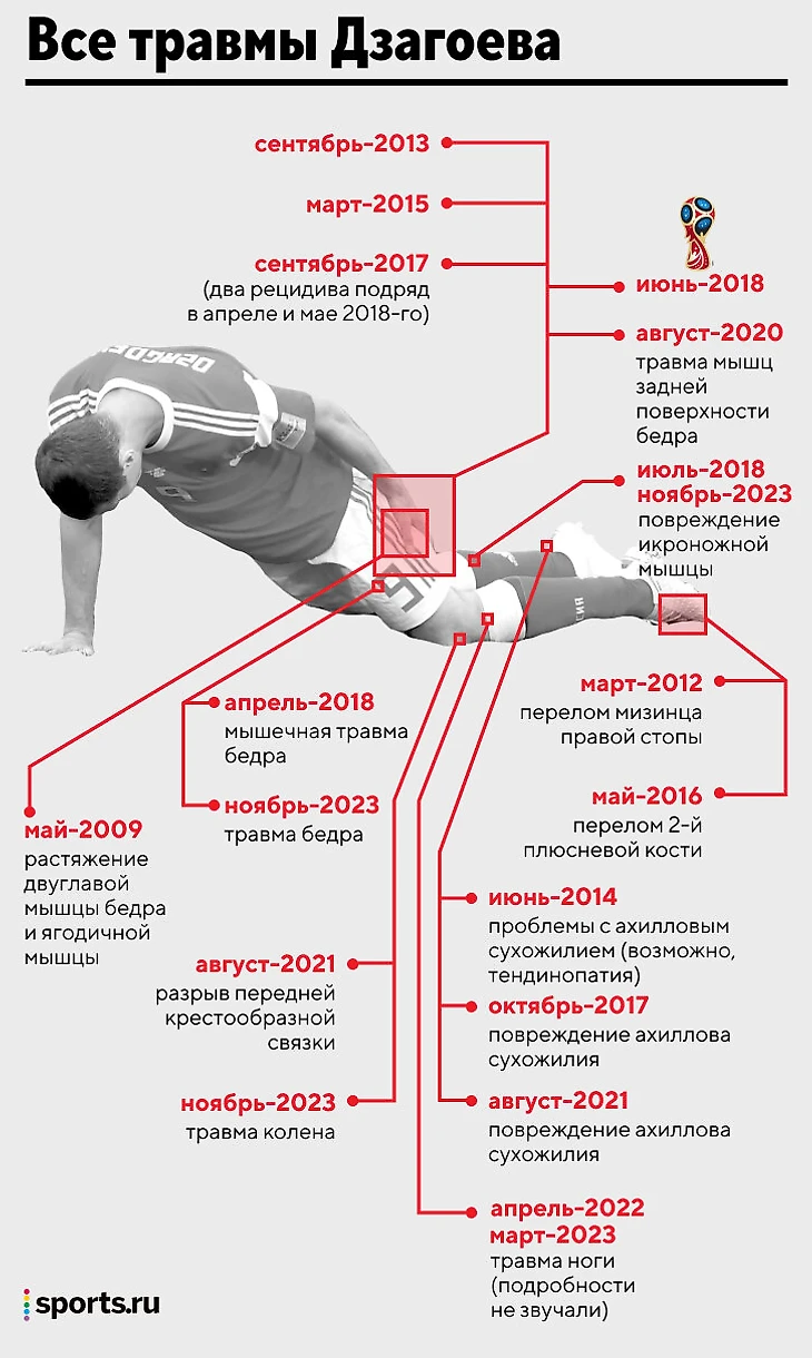 На последнем отрезке в ЦСКА из-за травм Дзагоев пропустил не так уж много, но все равно на поле выходил редко. Стал игроком ротации. Возможно, снижение травматизма связано в том числе с уменьшением игровой практики.