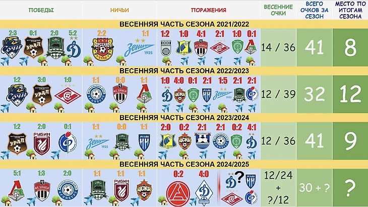 Три победы над конкурентами — «Уралом», «Рубином», «Факелом». Ничьи с «Зенитом» и «Краснодаром». Вроде бы всё неплохо, но разгромное поражение от «Динамо» и потеря очков в матчах с «Оренбургом», «Балтикой» и «Ахматом» портит картину.