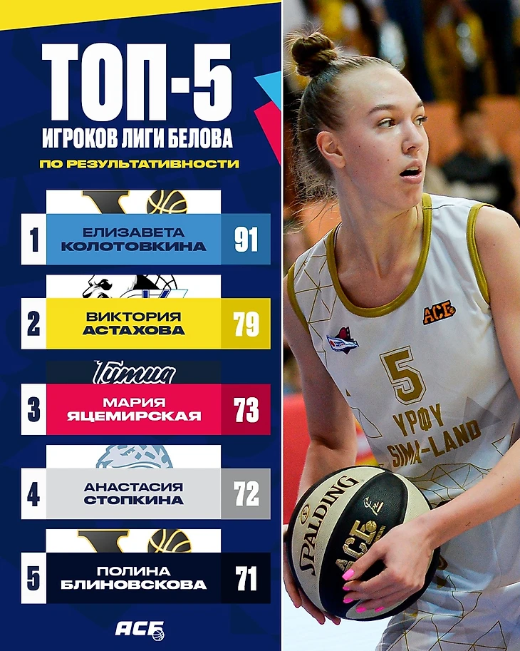 У девушек самый результативной баскетболисткой Лиги Белова (91 очко в 6 играх) стала MVP Суперфинала и всего сезона АСБ 2021/22 Елизавета Колотовкина. На втором месте оказалась лидер РГУФКСМиТ Виктория Астахова. Проведя на две игры меньше конкуренток, она записала в свой актив 79 очков. На третьем месте в рейтинге игрок ГУТиД Мария Яцемирская – 73 набранных очка за 6 встреч.