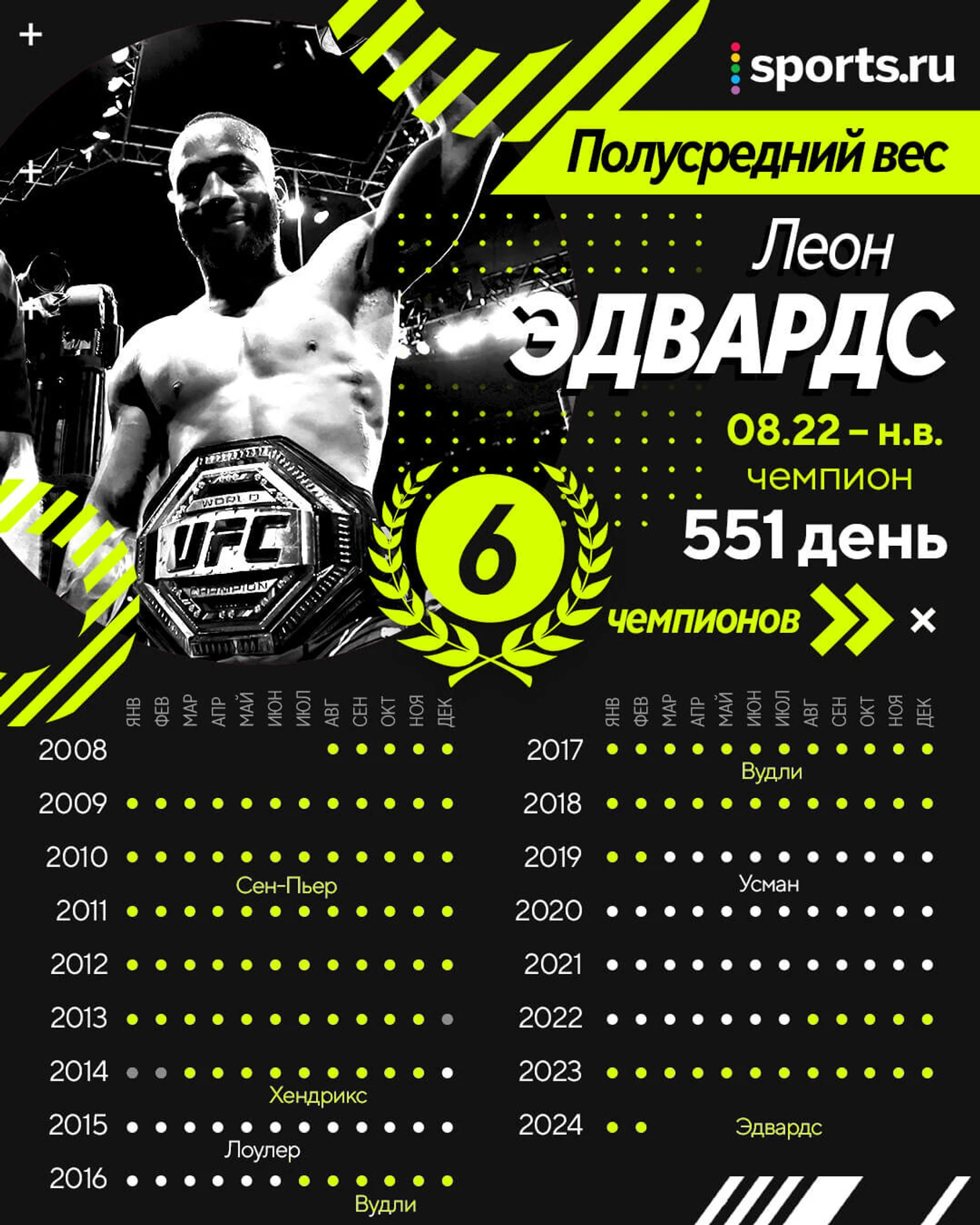 Небольшая турбулентность произошла после ухода доминирующего чемпиона Жоржа Сен-Пьера, но затем пояс выиграл Тайрон Вудли, собравший четыре защиты титула, а после него – Камару Усман с пятью. Сейчас на вершине Леон Эдвардс, который уже дважды защитил титул и имеет все шансы повторить результат Вудли или даже Усмана.
