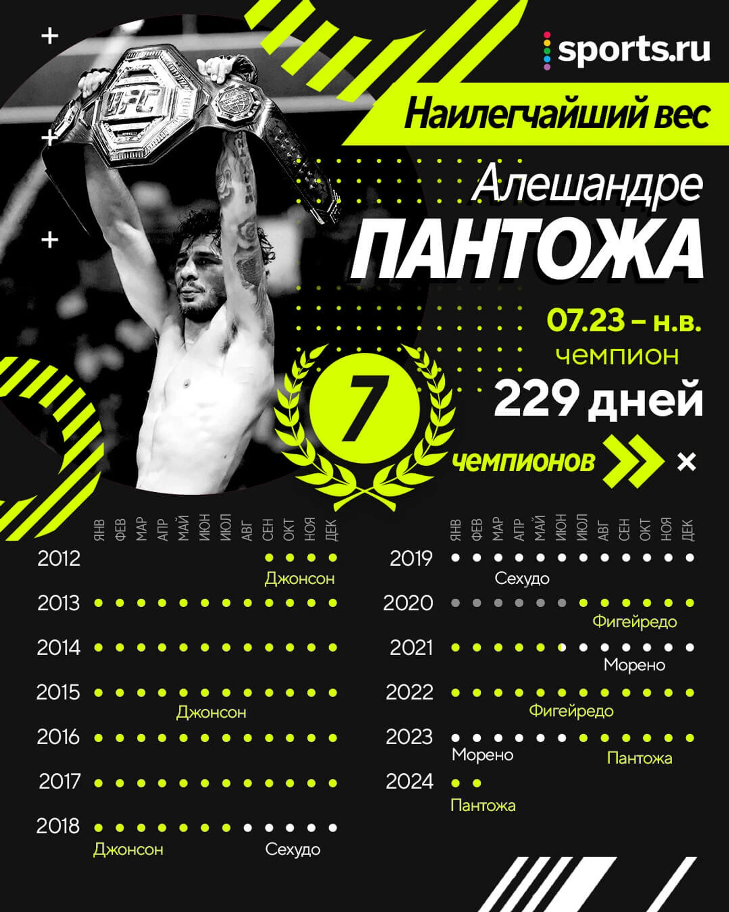 После завоевания титула Сехудо защитил его один раз и ушел в легчайший дивизион. А в наилегчайшем началась эра Дейвисона Фигейредо и Брэндона Морено. Передача титула между этими двумя добавила в дивизион с одним из самых доминирующих чемпионов три дополнительных смены титула. Сейчас Алешандре Пантожа закрепился на вершине, но уже в следующем поединке титул снова может забрать Морено.