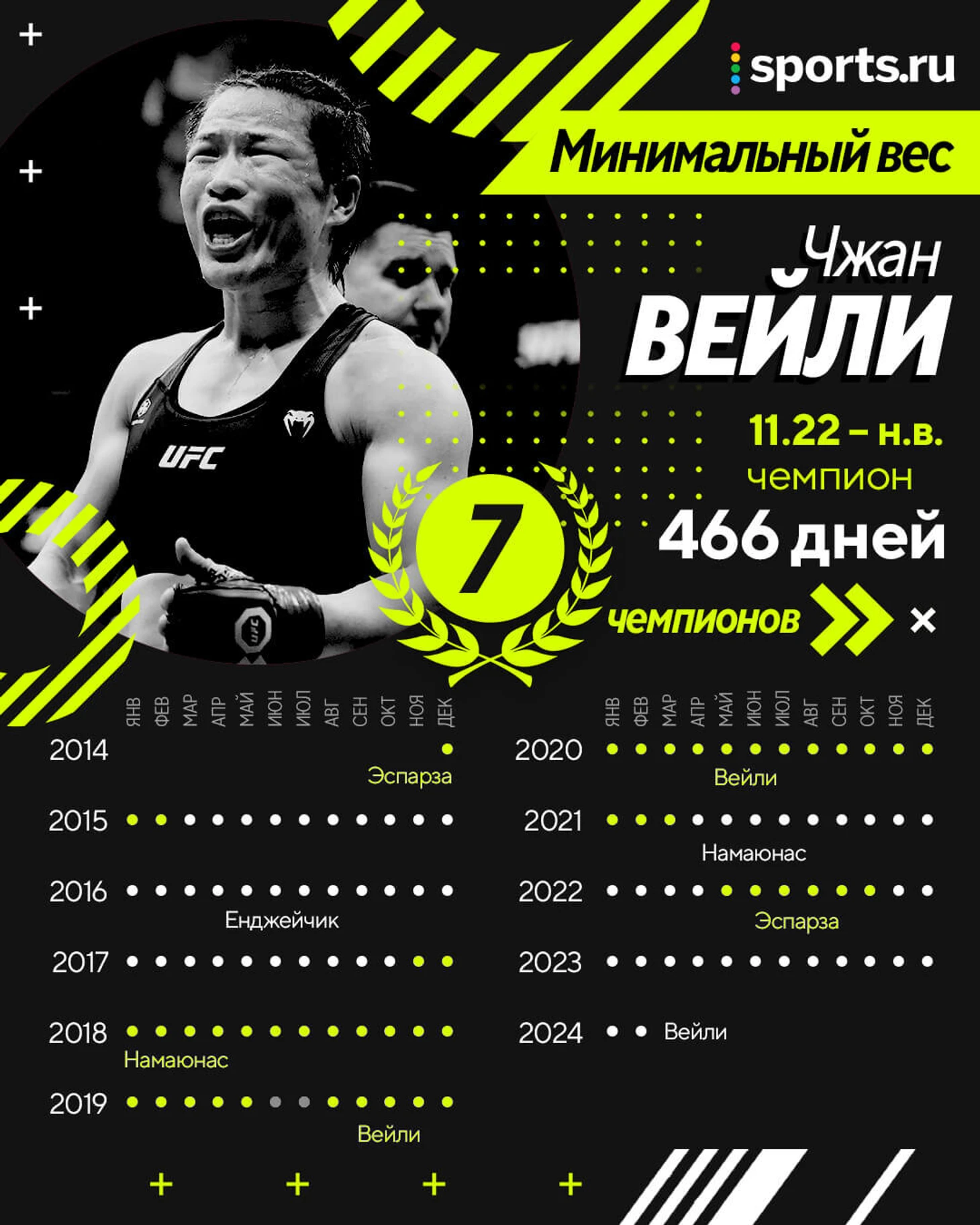 В женском наилегчайшем дивизионе наименьшее количество чемпионок. Объяснения два. Первое – это самая молодая весовая категория в UFC. Второе – в этой весовой категории долгое время доминировала Валентина Шевченко, собравшая семь защит.