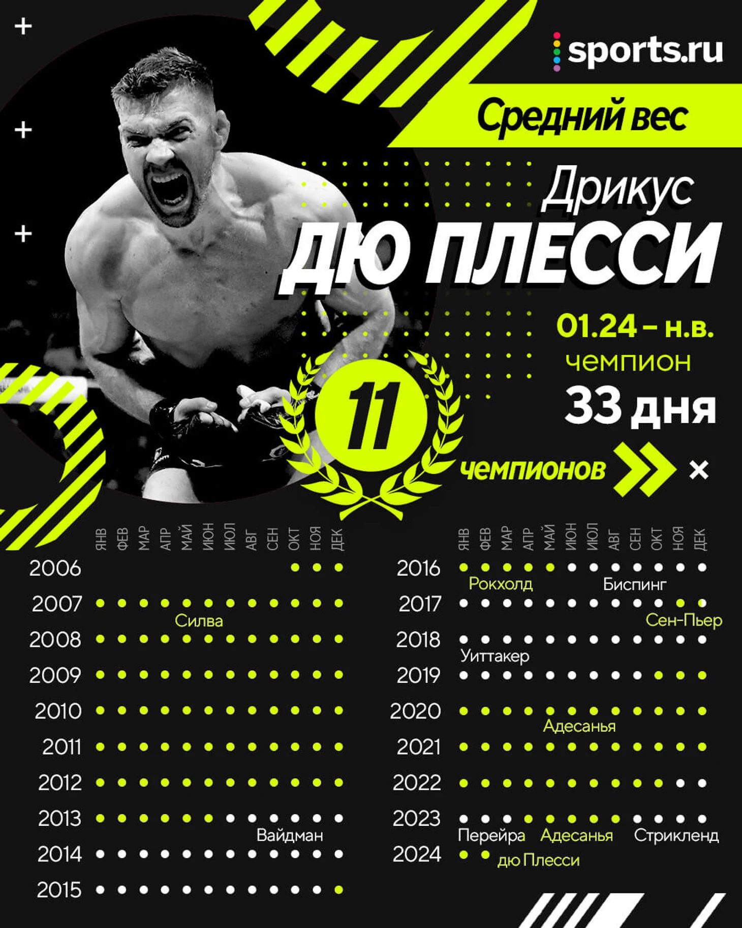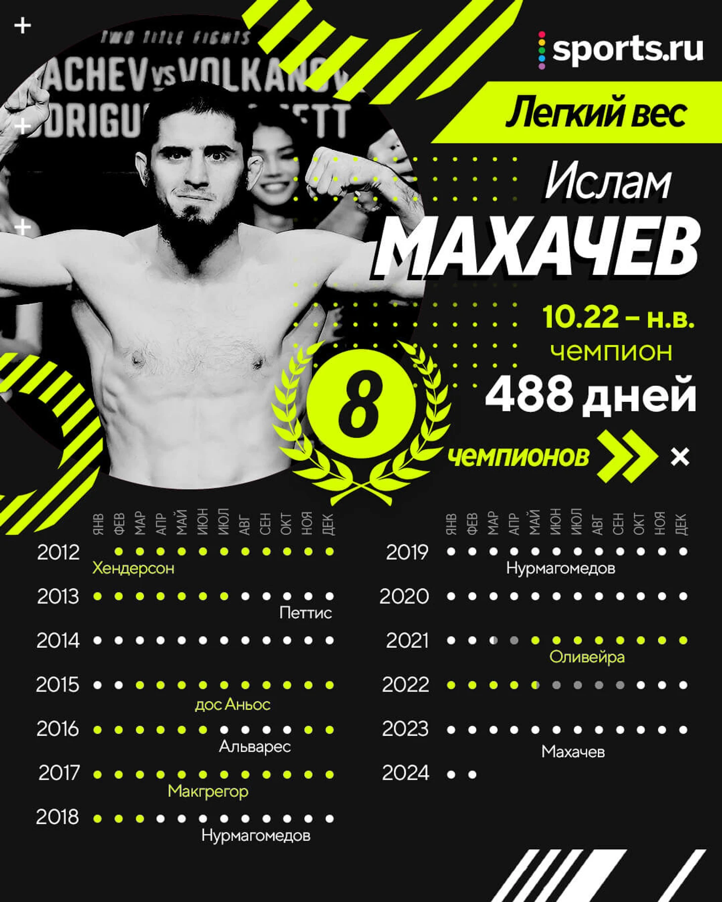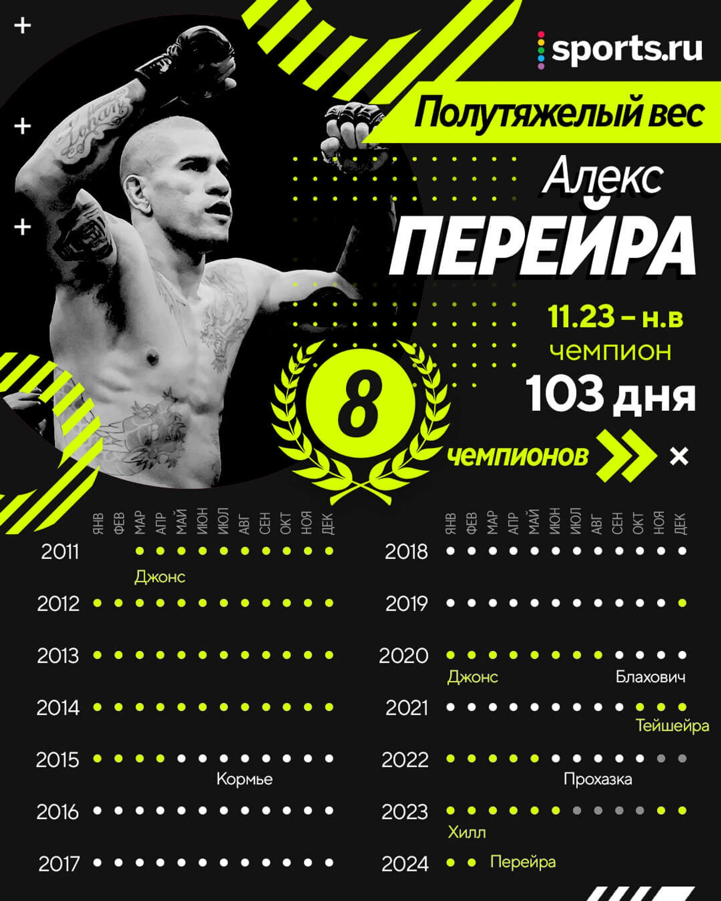 Не так давно случился еще один форс-мажор: Чарльз Оливейра впервые в истории освободил пояс из-за проваленной весогонки. Все это привело к тому, что за последние 12 лет в легком весе восемь разных чемпионов – второе место после среднего веса.