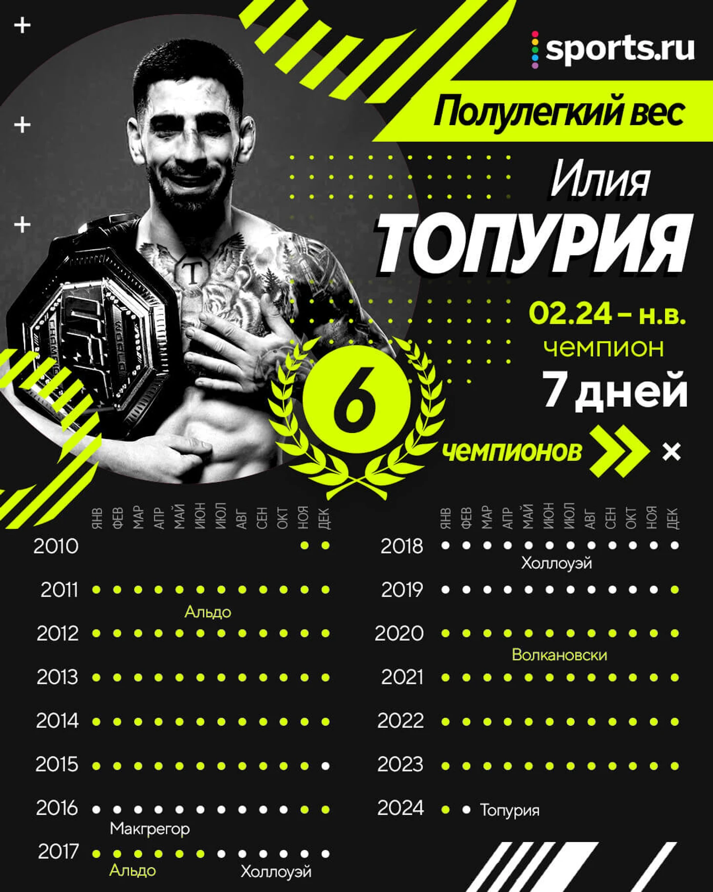 Илия Топурия – новый чемпион полулегкого веса UFC, который завершил эру Алекса Волкановски (пять раз подряд защищал титул). За все время существования этого дивизиона в UFC Топурия лишь пятый чемпион.