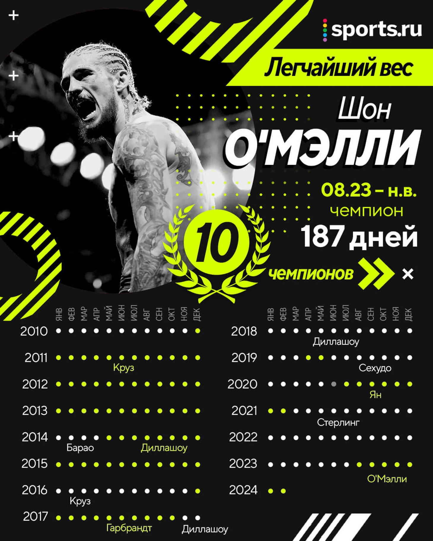Легчайший вес – второй по количеству чемпионств за последние 12 лет. В первой части десятилетия причиной частых смен лидера был Доминик Круз – постоянные травмы вынудили его объявить пояс вакантным в 2014 году, а в 2016-м он вернулся и забрал титул обратно. Позже титул снова оказался вакантным из-за допинга Ти Джея Диллашоу. Он провел лишь одну защиту титула перед тем, как его дисквалифицировали на два года.