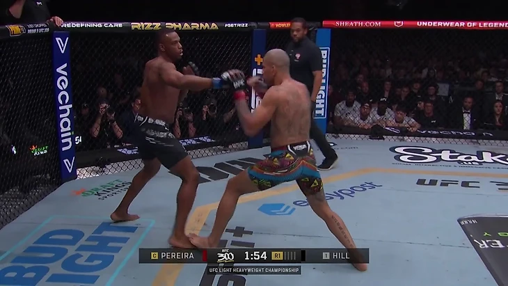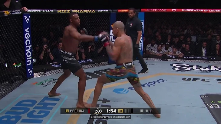Хилл и Перейра начали поединок в противоположенных стойках: Хилл – левша, Перейра – правша. Самое важное в таком поединке – работа передних рук. Это особенно критично против таких бойцов, как Перейра: ударники, у которых есть нокаутирующий удар с передней руки.