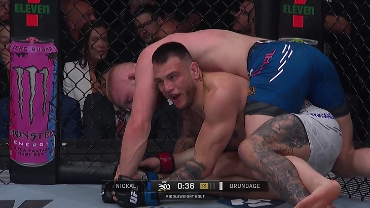 Позже он переместился в маунт, попытался провести треугольник руками, но снова неудачно. Лишь когда Брандэйдж снова, в третий раз за поединок, отдал спину, Никал все-таки закрыл удушающий сзади.