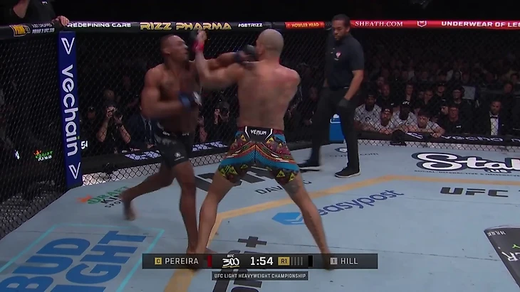 Перейра попал левым хуком-апперкотом и отправил соперника в тяжелый нокдаун, после чего добил на земле.