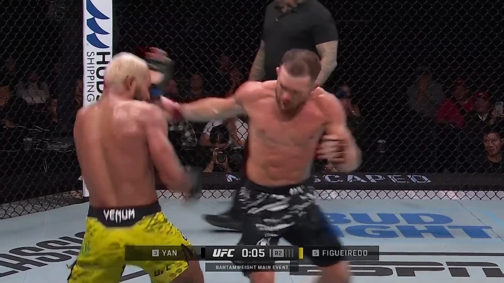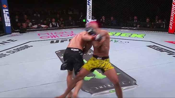 Что в такой ситуации делать Яну? Разумеется, идти бороться с лучшим грэпплером дивизиона – не лучший вариант. Терять позицию тоже не хочется – уж слишком она безопасная и комфортная. Что остается? По современным правилам – ничего, ведь в таком случае бить коленом не разрешается. Правда, как мы помним, в том бою Ян про это забыл.