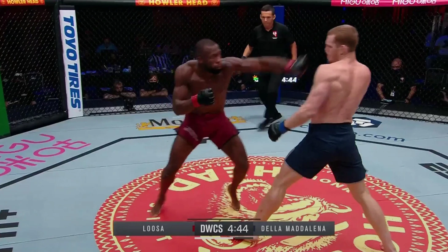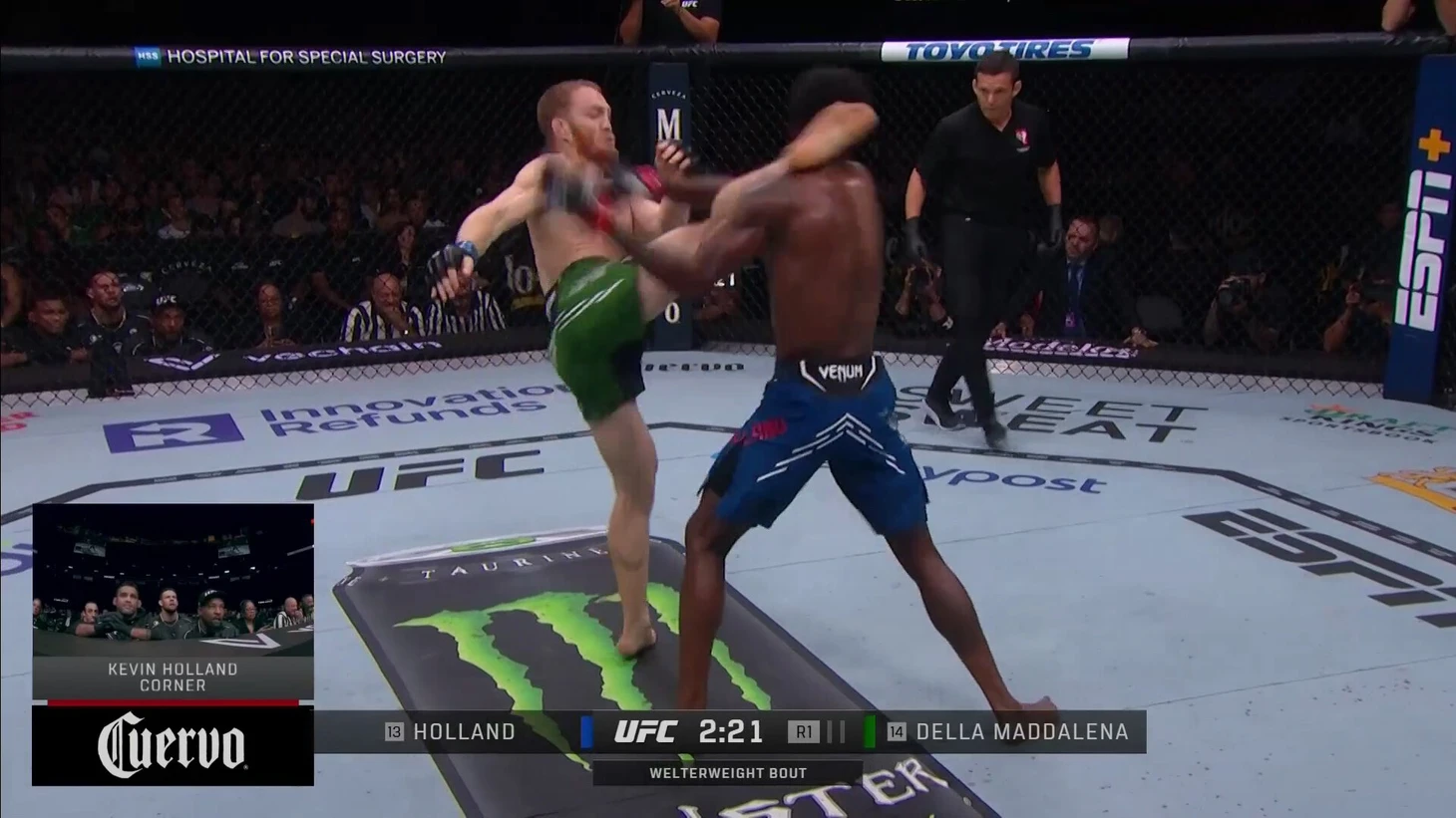 Да, нужно упомянуть и кики Маддалены. Несмотря на то, что он гораздо чаще использует руки, удары ногами при случае тоже залетают достаточно мощно. Случаются даже вот такие хай-кики против гораздо более высоких соперников: