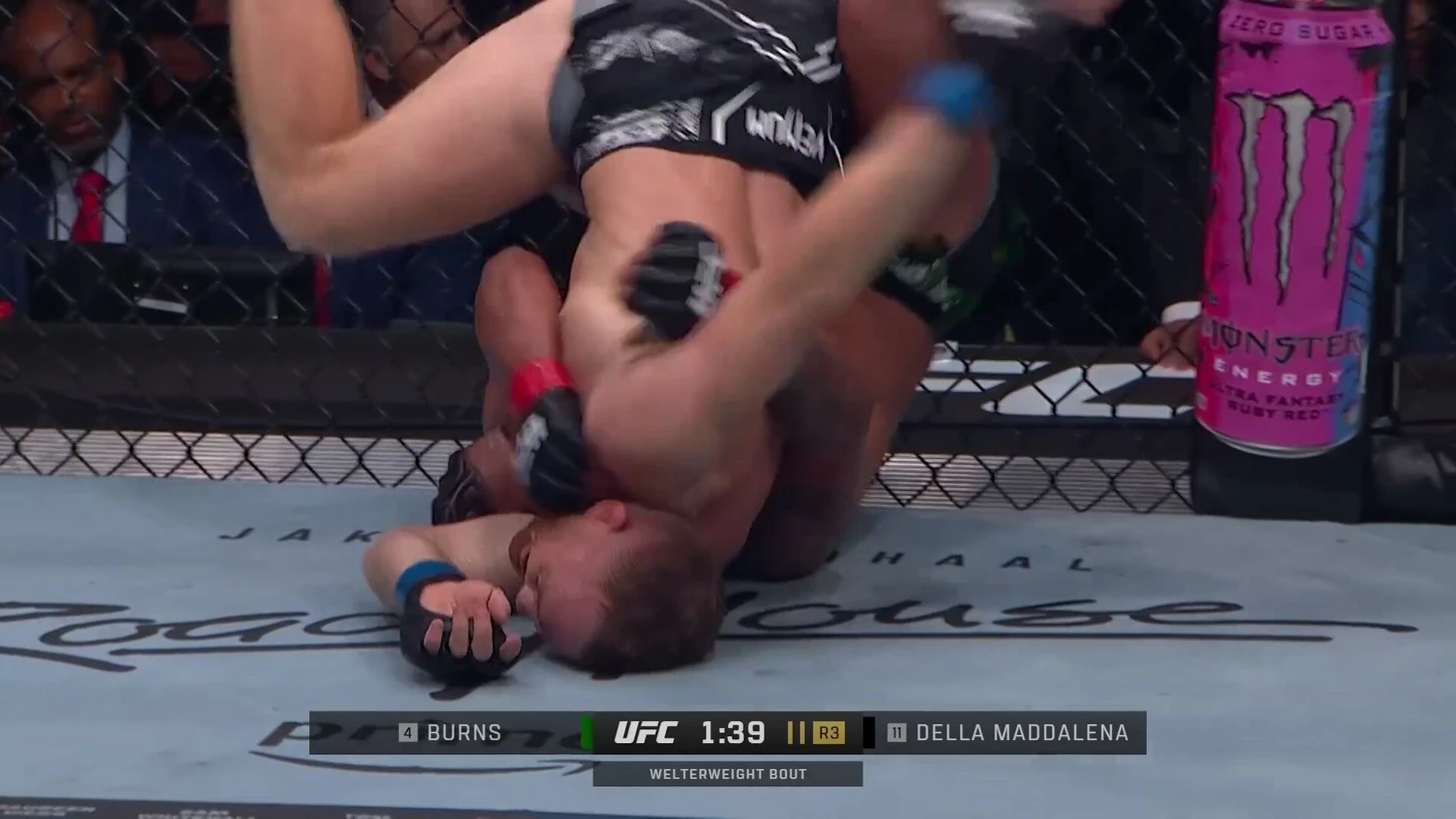 В борьбе на земле Маддалена показал себя так, как и ожидалось – изворотливым и прытким. Полностью лежащим на спине он оказался лишь в пятом раунде и в таком положении провел около минуты. Пытаясь выбратьсяиз хаф-гарда Мухаммада, Маддалена сначала совершил ошибку, прижав соперника к себе, но потом исправился и достаточно быстро поднялся из партера. В конце раунда он снова оказался на земле, но практически тут же поднялся с помощью кувырка.