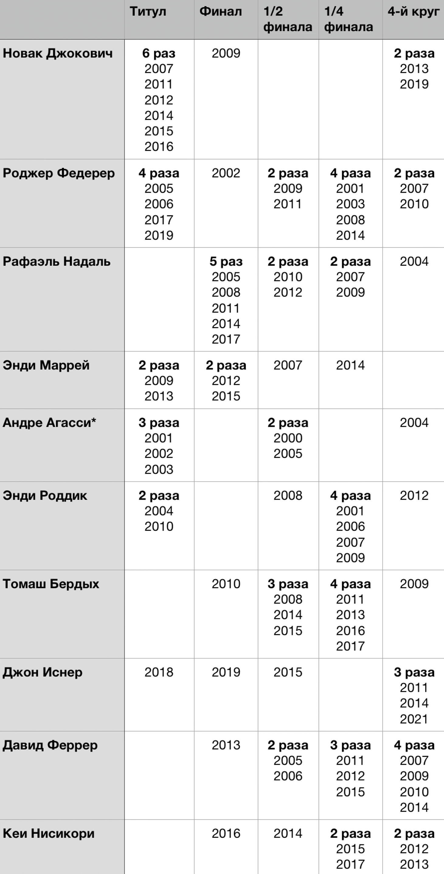 Андре Агасси смог стать звездой двух десятилетий, стабильно демонстрируя высочайший уровень тенниса. Первые матчи Агасси проводил еще в Ки-Бискейне - предшественнике Мастерса в Майами - в 1987 году. Первая победа пришла в 1990, когда в финале был повержен великий Стефан Эдберг, а затем последовали еще две победы (1995-1996) и два проигранных финала (1994 и 1998). В нынешнем тысячелетии Агасси еще трижды выиграл турнир (2001-2003) и дважды играл в полуфинале (2000 и 2005).