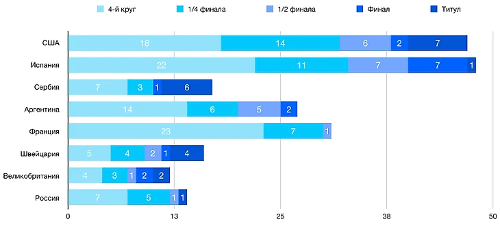 Исторически именно теннисисты из США достигли самых выдающихся результатов в XXI веке на турнирах в Майами. На их счету, начиная с 2000 года, семь побед - 3 у Агасси, 2 у Роддика, по одной у Пита Сампраса и Джона Иснера. Чуть хуже выступали испанцы - одна победа у Карлоса Алькараса и 7 финалов: 5 у Рафаэля Надаля и по одному у Давида Феррера и Карлоса Мойя. Замыкают тройку сербы усилиями Джоковича (6 побед и финал), Миомира Кецмановича (1/4 финала) и Янко Типсаревича (два 1/4 финала).