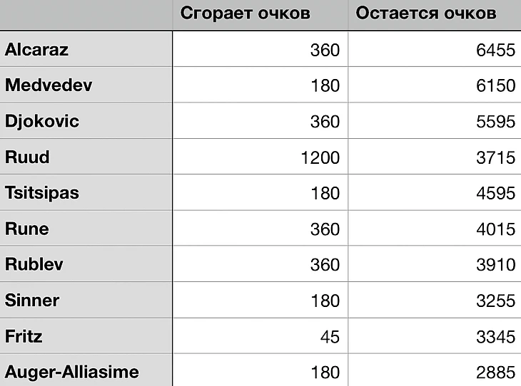 Больше всего очков нужно защищать Касперу Рууду - 1200 за финал Ролан Гаррос 2022 года. Учитывая не самую выдающуюся форму норвежца и накапливающуюся усталость от нон-стоп участия в турнирах, есть обоснованные опасения считать, что Рууду не удастся повторить прошлогодний результат. Такое развитие событий при условии удачного выступления ближайших преследователей может откинуть Каспера на 3 рейтинговые позиции назад.