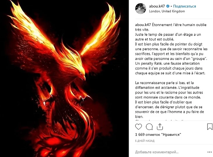 Камара запостил в инстаграм фото феникса с объемным комментарием: