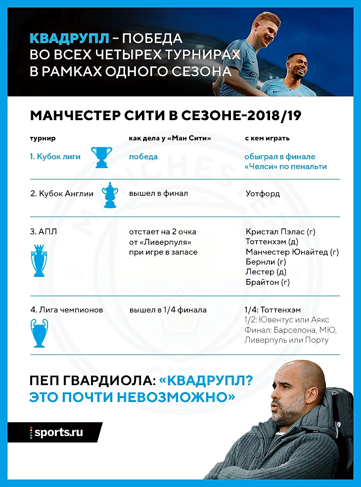 «Взять квадрупл почти невозможно. Так и напишите в заголовках, – это уже Пеп после выхода в финал. – То, что мы до сих пор претендуем на 4 титула – уже чудо. Правда в том, что достичь всего практически невозможно».