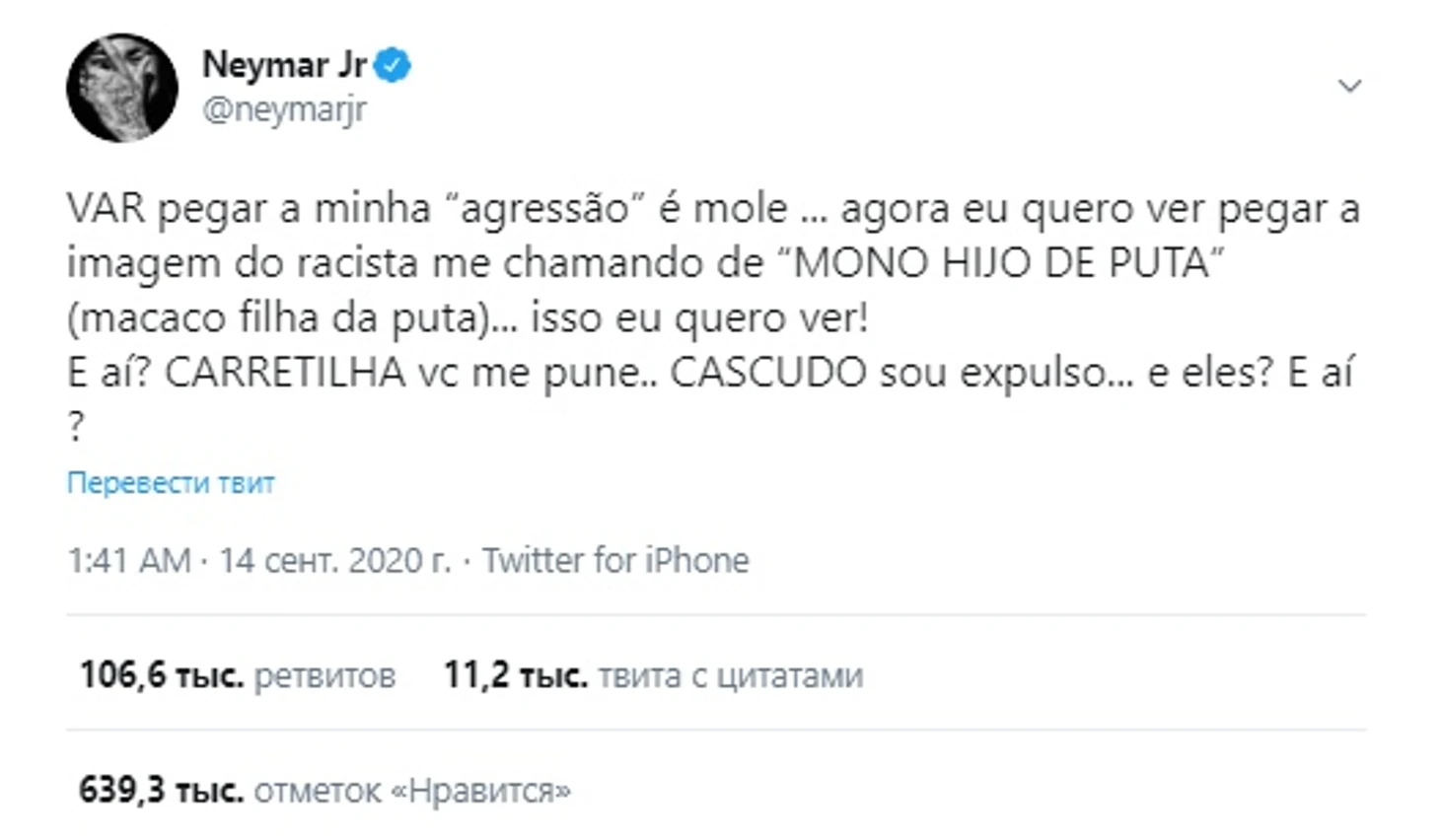 «ВАР легко увидел мою агрессию... А я теперь хочу увидеть кадры с расистом, называющим меня грязной обезьяной... Я хочу их видеть! Что происходит?!»