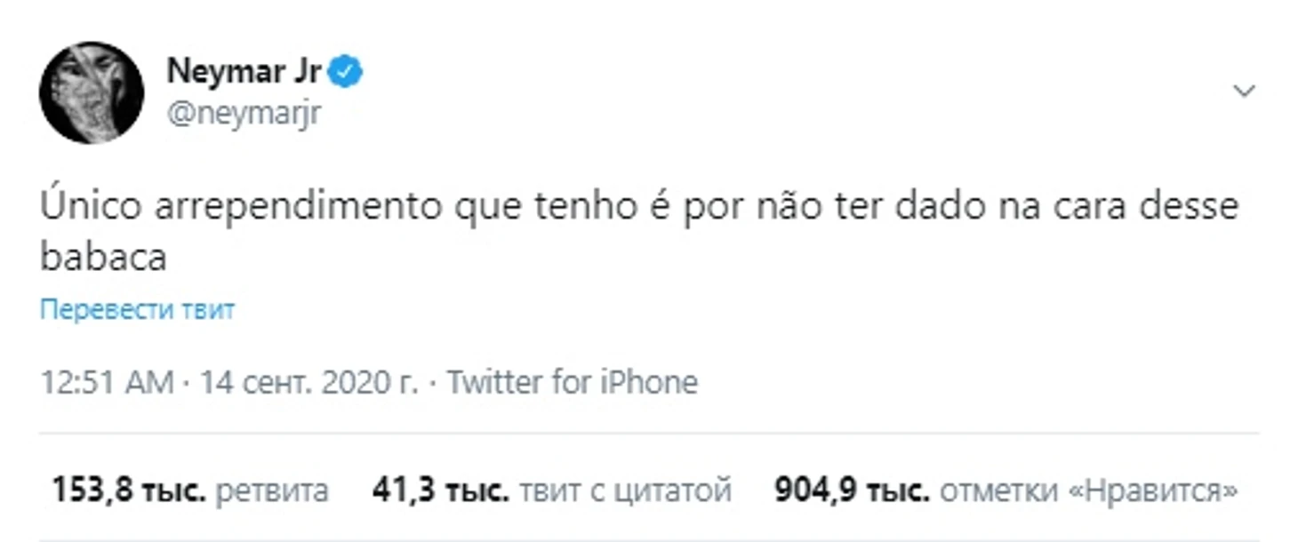 Уже из раздевалки Неймар написал два гневных твита: «Единственное, о чем я жалею, это о том, что не ударил мудака в лицо».